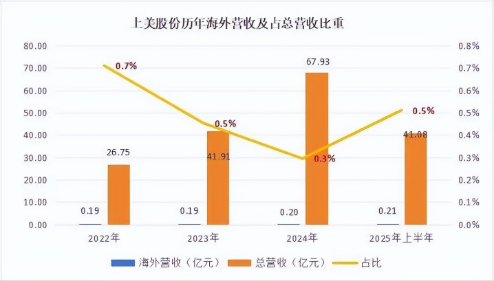 但从现有业绩报告来看,上美股份的国际化业务仍处于起步阶段,尚未形成有效营收贡献。虽然2025年上半年的海外收入已经超过2024年全年,但0.21亿元的规模对整体业绩根本是聊胜于无。