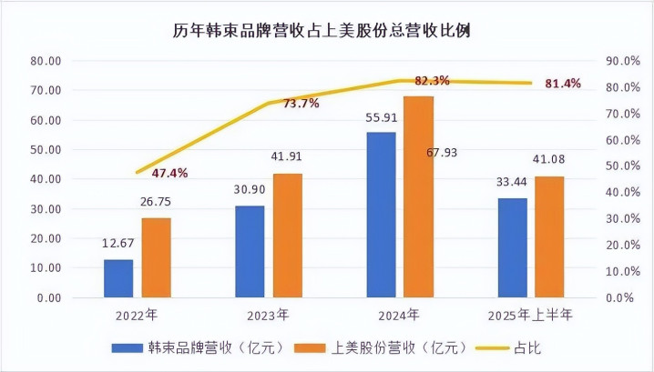 {jz:field.toptypename/}但在亮眼成绩单下,几乎是韩束品牌在“独舞”。从2022年的47.4%,到2023年的73.7%,韩束的营收占比逐年攀升。2024年韩束营收55.91亿元,占公司总营收比重高达82.3%,同比增长80.9%;2025年上半年,韩束营收33.44亿元,占比仍维持在81.4%,同比增长14.3%。