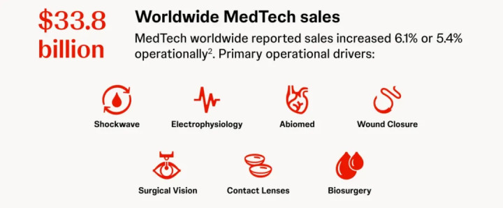 从财务数字来看,2025年Q4强生MedTech业务全球销售额为88.01亿美元,同比增长7.5%;全年销售额338亿美元,同比增长6.1%。
