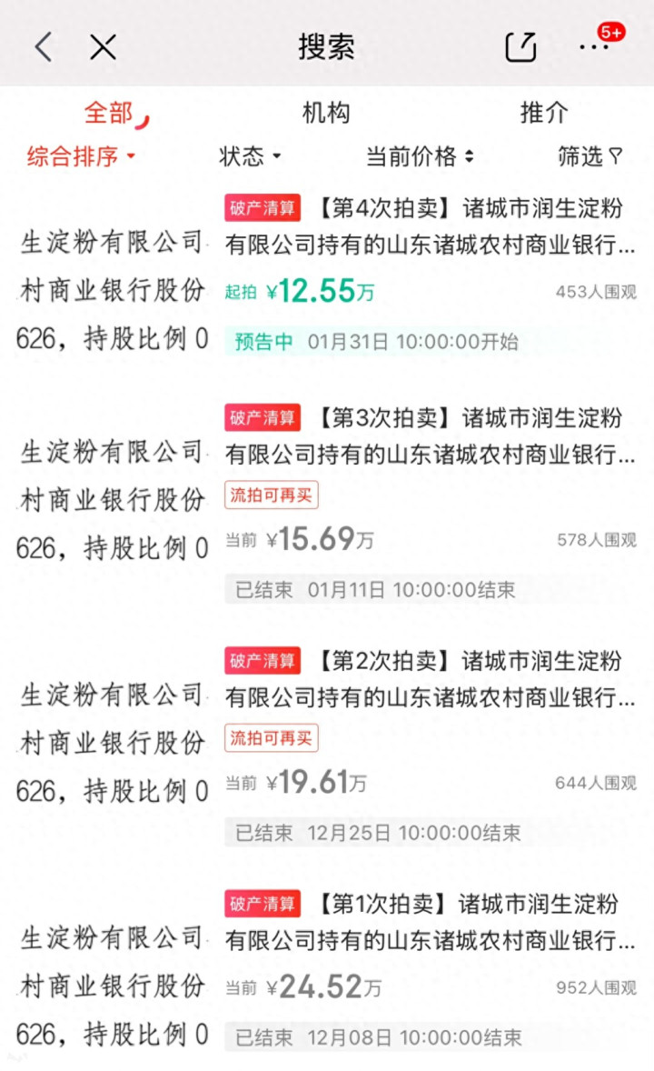 此次拍卖的股权占诸城农商行总股本的比例仅为0.0116%,却因其“出身”而备受关注。转让方是由诸城市润生淀粉有限公司等五家企业组成的“实质合并破产清算”资产包,这意味着相关股东的经营危机已被司法程序确认。