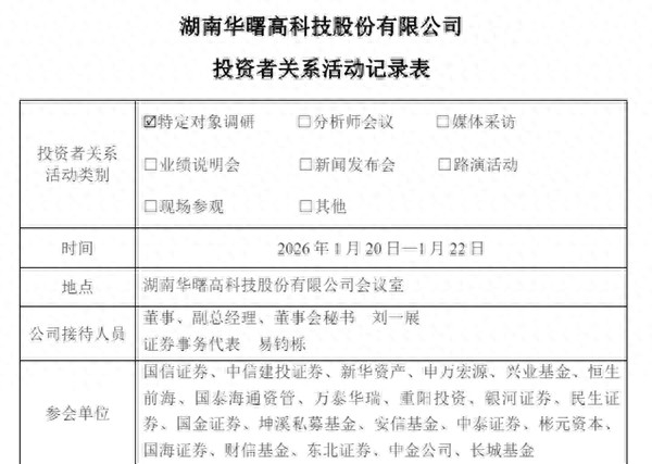 红网时刻新闻1月23日讯(记者李双贤)1月22日,湖南本土科创龙头企业湖南华曙高科技股份有限公司(以下简称“华曙高科”)发布公告,披露公司于1月20日接待国信证券、中信建投证券、财信基金等20余家知名券商、基金及投资机构调研,公司董事会秘书刘一展及证券事务代表易钧栎详细回应合资公司布局、航空航天业务进展等市场关切。