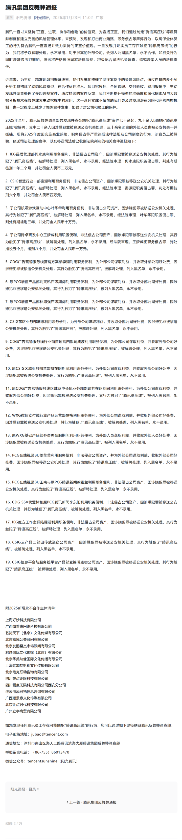 简单总结:这是一份腾讯的“年度反腐成绩单”,目的既是内部震慑(告诉员工别伸手),也是对外展示(给公众、合作伙伴和投资人看),表明公司治理严格,对腐败零容忍。