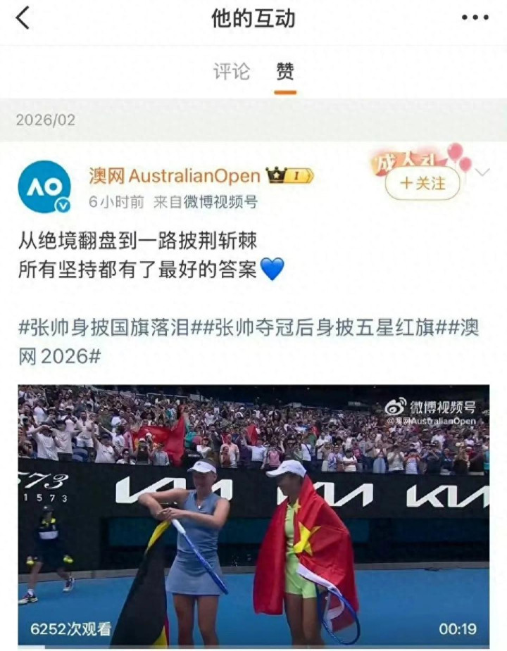 {jz:field.toptypename/}在张帅拿到澳大利亚网球公开赛女双冠军之后,澳大利亚网球公开赛官微专门发了张帅夺冠的视频并配文:从绝境翻盘到一路披荆斩棘,所有坚持都有了最好的答案。