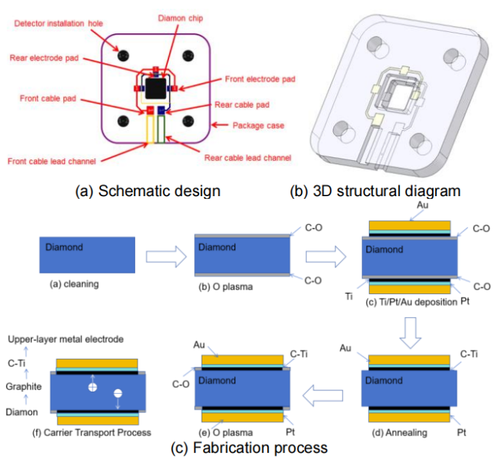 图1.采用Ti/Pt/Au电极结构并采用航空航天级FR4封装的金刚石探测器设计与制造