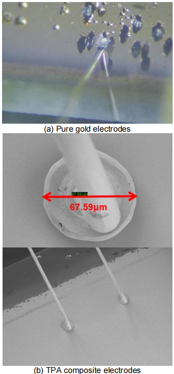 图2.金属线键合对比:金刚石探测器用TPA复合材料电极与纯金电极