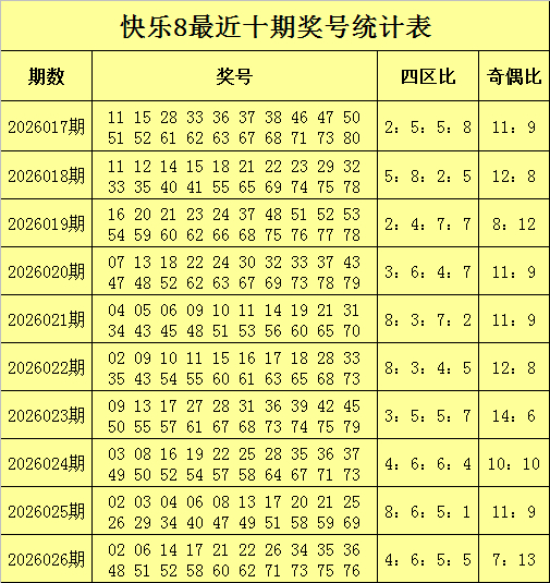 福彩快乐8第2026026期开奖回顾:02 06 14 17 21 22 26 34 35 36 48 51 52 58 60 62 71 73 75 76,其中奖号四区比为4:6:5:5,奇偶比为7:13。