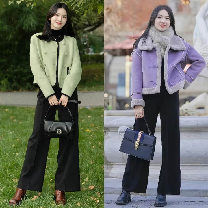 很多短外套,都是没有口袋设计的,所以我们就需要准备一款包包,挑选包包款式的时候,风格上要和穿搭统一,颜色和服装呼应,才不会有违和感,做到“衣包合一”的境界,方可收获高级气质。