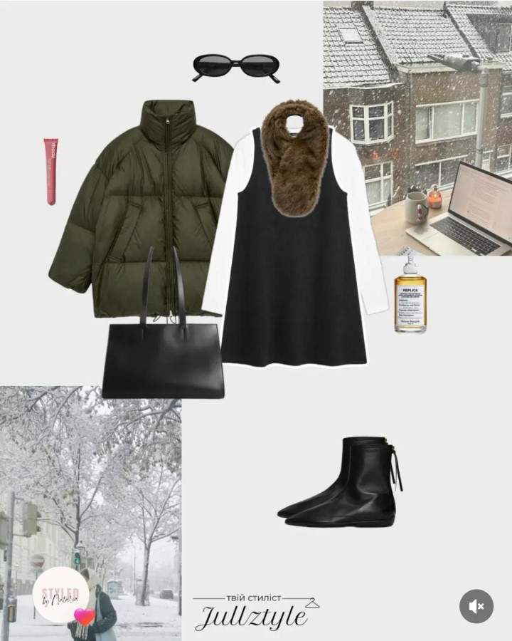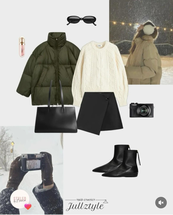 有了暖和厚实的羽绒服,内搭就可以有更多变化,干净的白色小圆领毛衣,再搭不规则剪裁的小黑裙,只要有够温暖的打底裤,冬天也能穿得活泼。