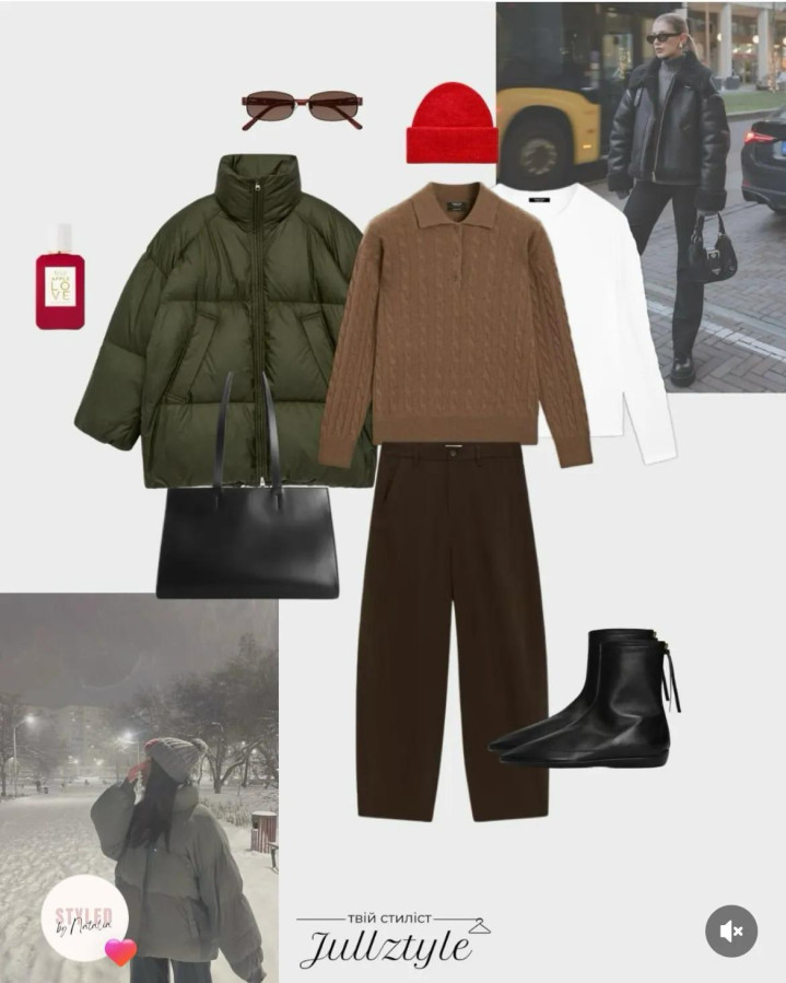廓形款的面包羽绒服真心值得选,松柏绿的色调也让羽绒服多了些特别之处,搭同色系毛衣再搭香蕉裤,主打一个厚实又醇厚。