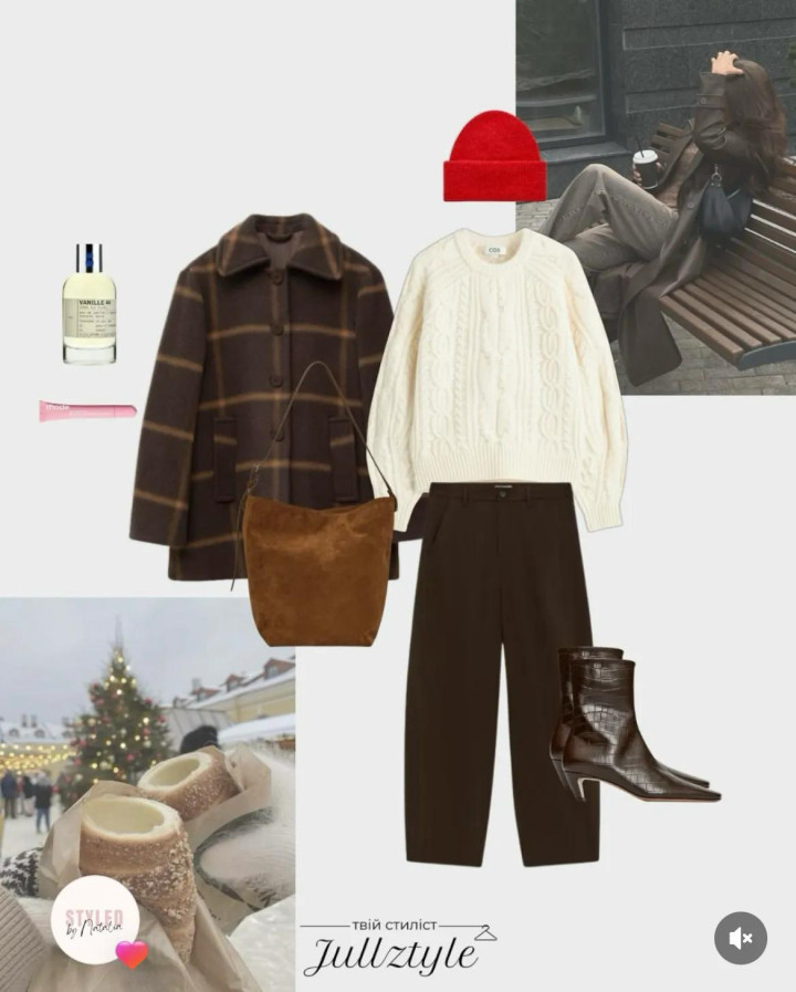 还可以用更温柔明亮的内搭,奶白色毛衣点缀一顶大红毛线帽,整个人立刻就有神采起来,把咖色系的外套也更有对比感。