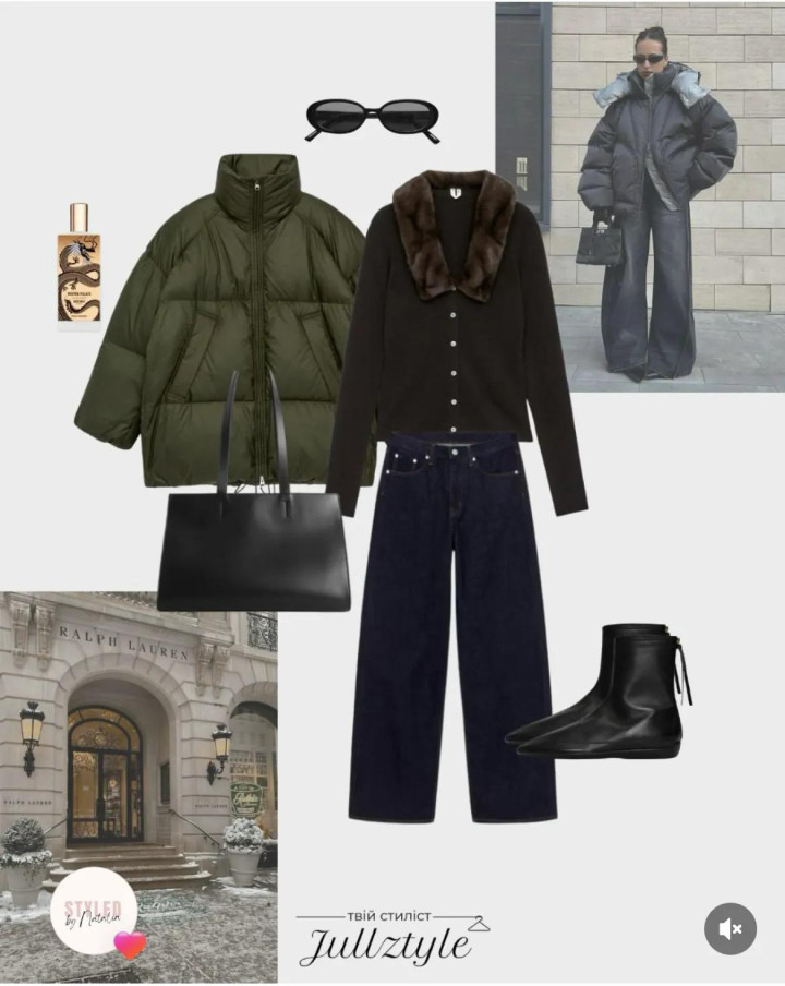 依然是百搭的绿色羽绒服,可以在内搭上有更多精致感。黑色纽扣小毛衣有毛领点缀,配合身的直筒牛仔裤,短靴一收尾,milansports就是有型又潇洒的穿搭。