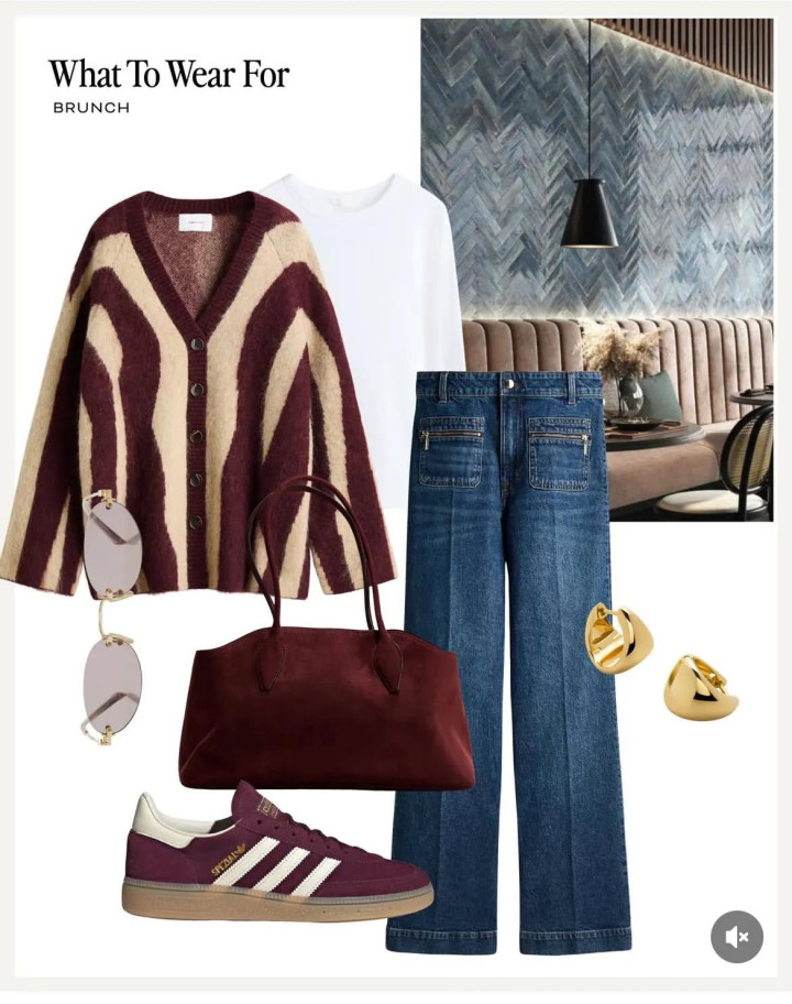 条纹毛衣我们都很熟悉,可是流水波纹就不一样啦。尤其遇到柔软的开衫毛衣,米色与酒红的相遇,是一件很好看的外套,正好搭配白衫蓝牛仔裤。最好用酒红色的球鞋和包包呼应,自然穿出减龄感。
