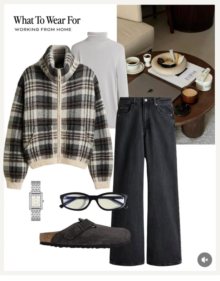 棉夹克很常见,但加入格纹会更别致,用合身的高领中袖衫搭配高腰阔腿裤,廓形的裤型很显腿长,也是很轻松就能穿得大方的搭配。