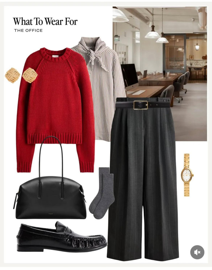 当然还有好看的毛衣啦,既然班还是要上,玫瑰红粗针脚毛衣,提气色还显白,轻松把深灰西装裤衬托的更洋气。或是用显瘦竖条纹的毛衣穿出修长感,领口再加入三角巾设计,雅致又大方。就用精心打扮给自己带来好心情吧。