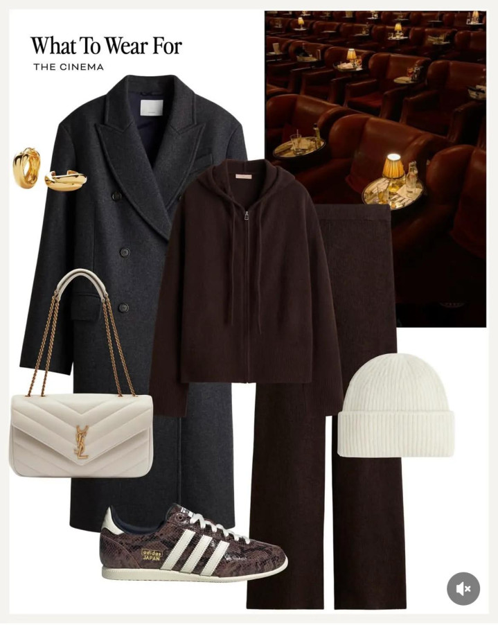 依然是长款大衣,深墨蓝配长及脚踝的款式,可以一件外套就锁定穿衣风度,直接用一身针织套装作为内搭,衣服看似简单却很显品质,而且还能保暖哦。最好点缀珍珠白单肩包和毛线帽,用日常款也能穿出好品味。