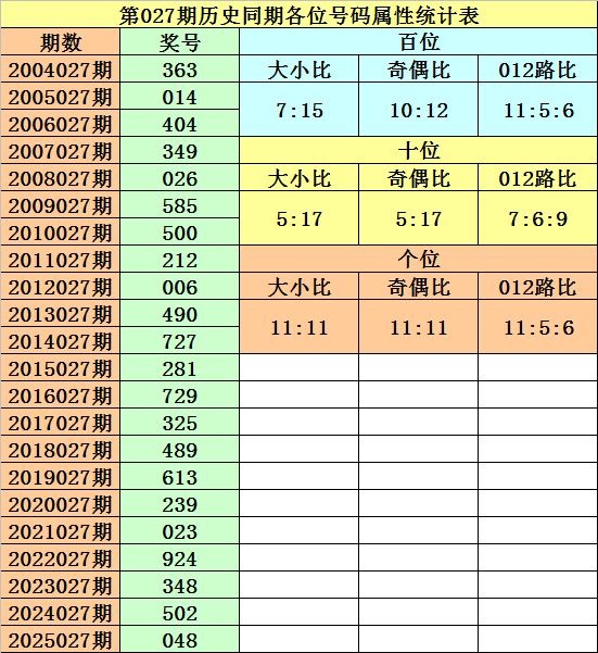 本期为排列三第2026027期开奖,历史上排列三第027期已开出了22期奖号了: