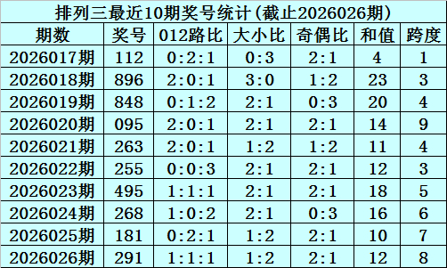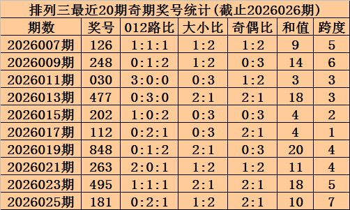 上期回顾:排列三2026026期奖号为291,奇偶比为2:1,大小比为1:2,跨度为12。