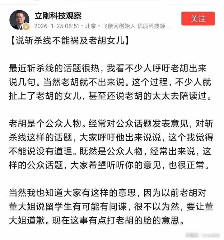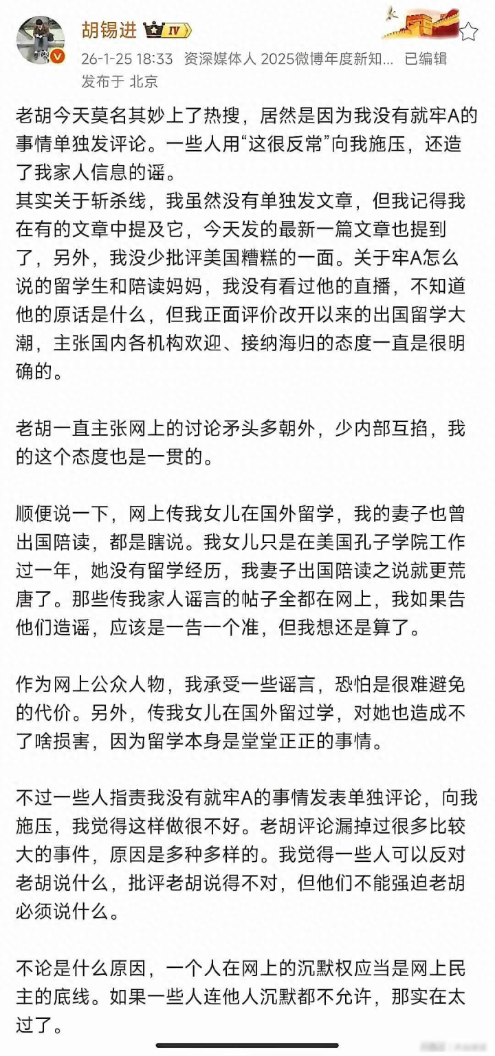1月25号傍晚,胡锡进发了一条长文,首次直接回应关于女儿留学和妻子陪读的说法,他提到女儿确实在国外待了一年,但那不是留学,是单位安排的孔子学院外派任务,属于公派性质,妻子也没有去陪读,没有长期住在国外,他的语气很平和,表示造谣的人一告一个准,但最终他没有走法律程序,选择不去追究。