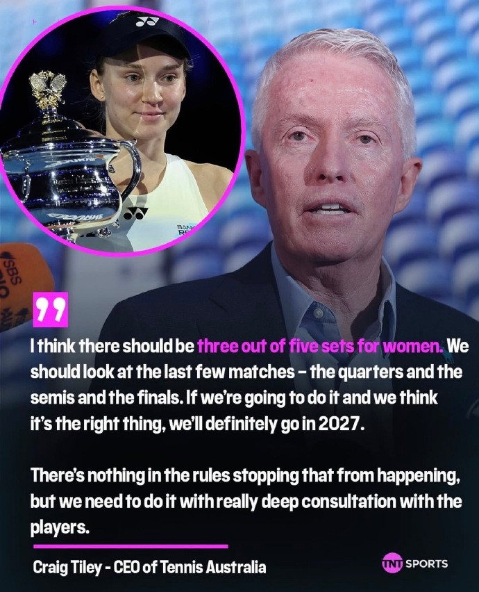 “我认为女子比赛应该采用五盘三胜制。我们需要重点研究最近几场关键赛事——包括四分之一决赛、半决赛和决赛。如果我们决定推行并认为这是正确的方向,那么2027年必然会实施改革,目前没有规则阻碍这项变革。