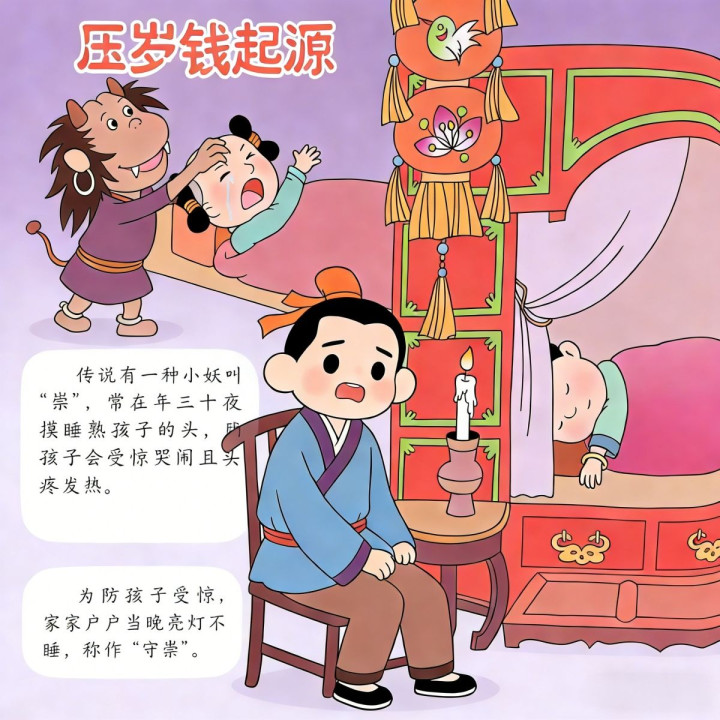 从那以后,家家户户都在孩子枕边放红纸包着的铜钱,这就是最早的压祟钱,慢慢就演变成了现在的压岁钱。