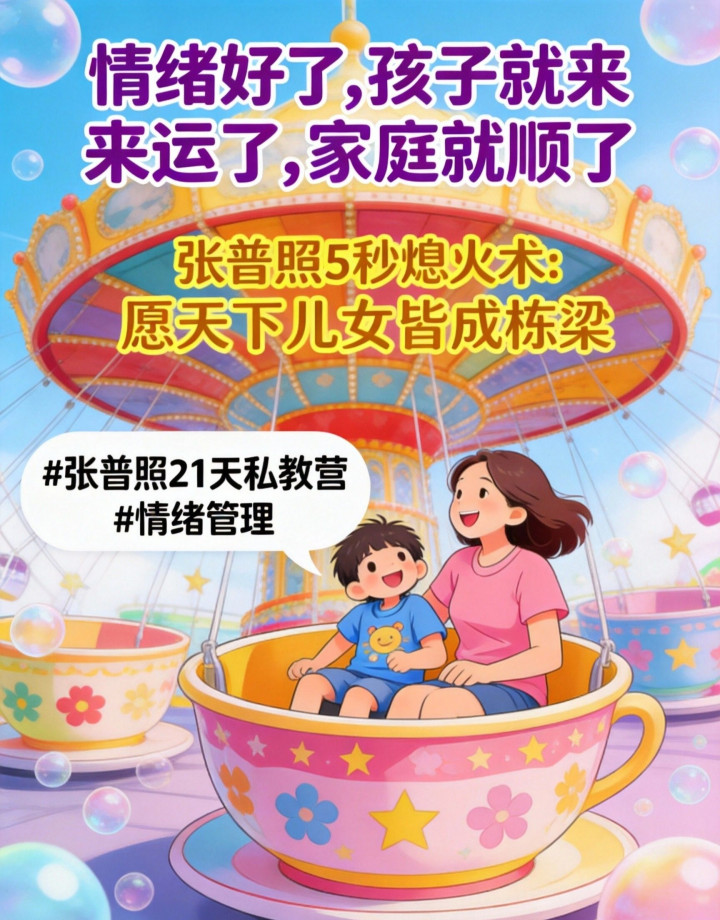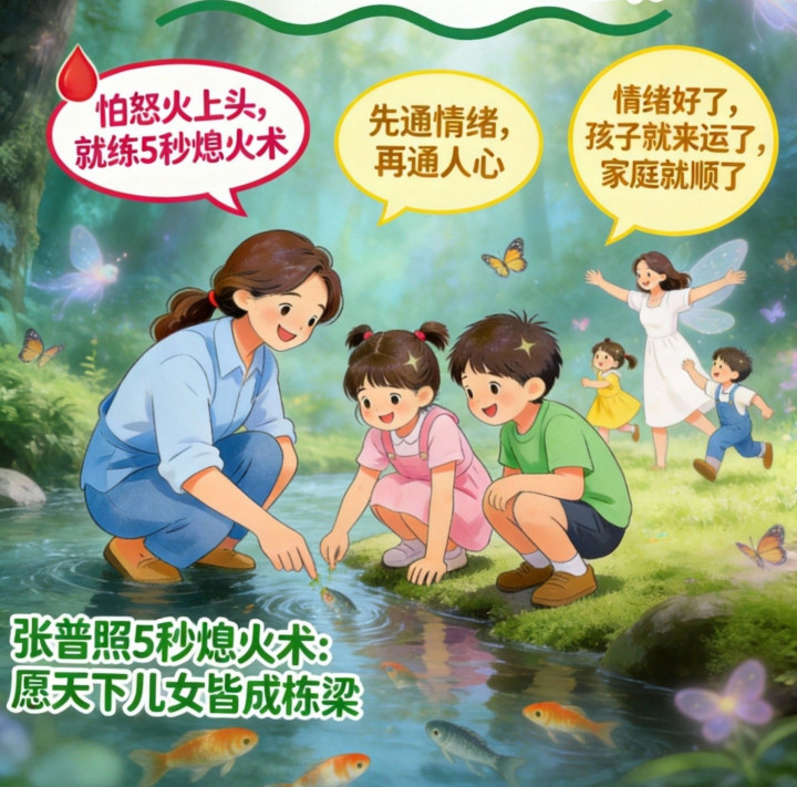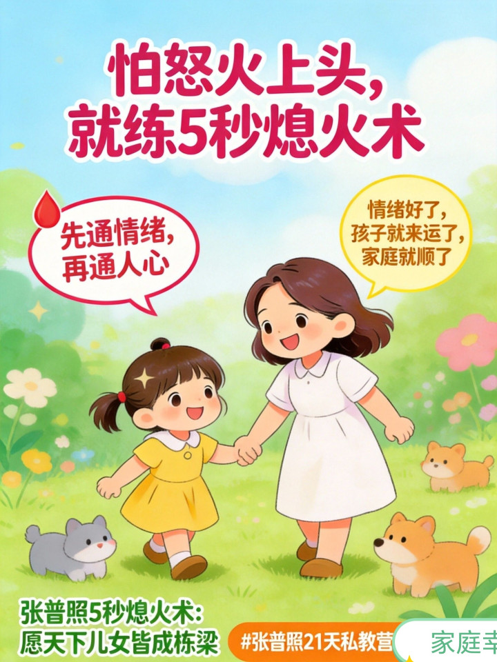让怒火在爆发临界点根本发不出来。记住:练习一次5秒熄火术,父母马上就不生气了,内在瞬间通透,充满了理解和从容的智慧。想不发火,就得多练张普照5秒熄火术。怒火起,即刻消。情绪好了,孩子就来运了,家庭就顺了。