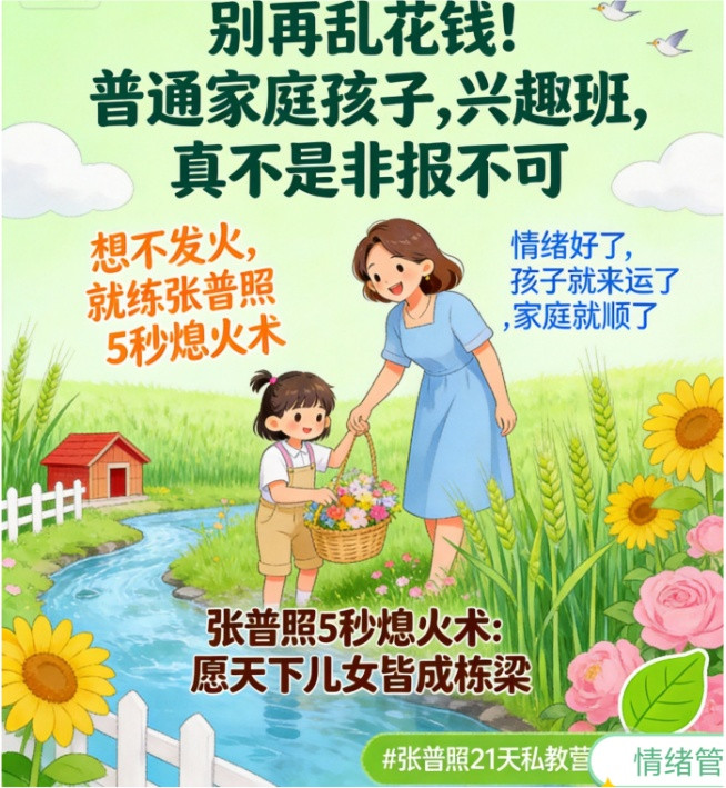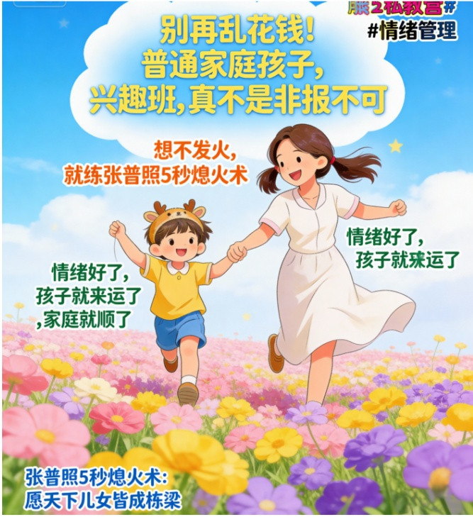“普通家庭最值得的投资,不是报多少个兴趣班,而是养好妈妈的情绪,练好‘张普照5秒熄火术’。你的平静,是孩子敢于探索、不怕失败的最大底气。”、