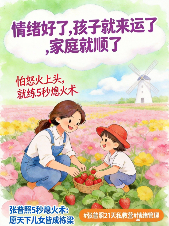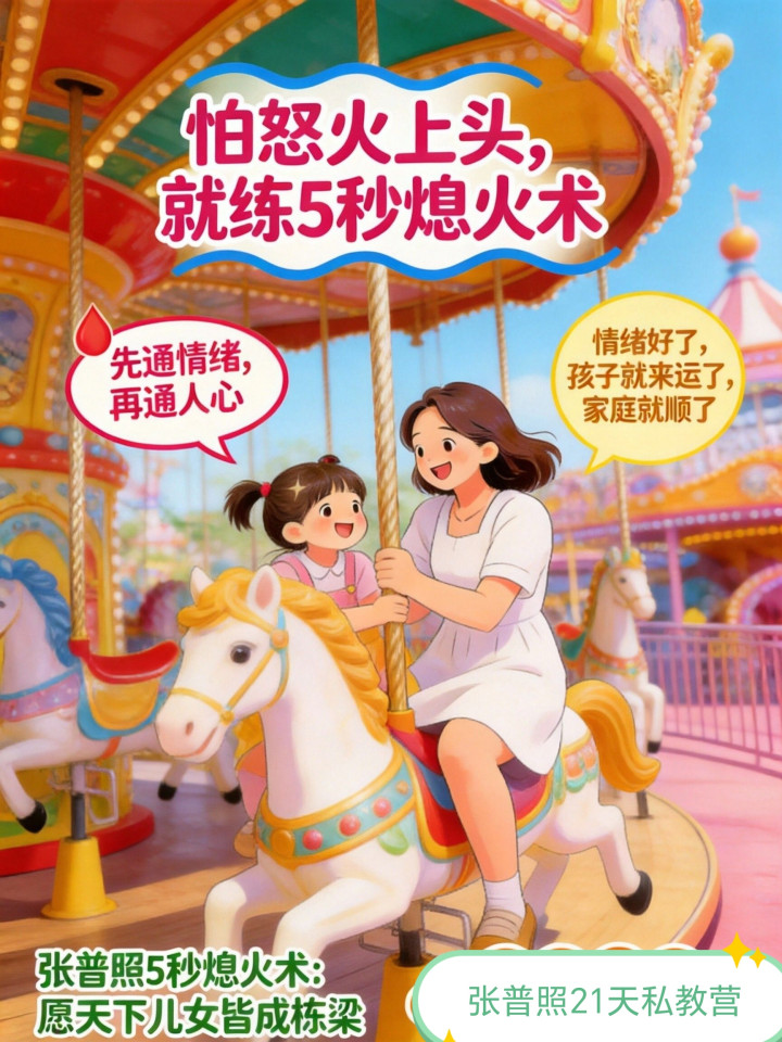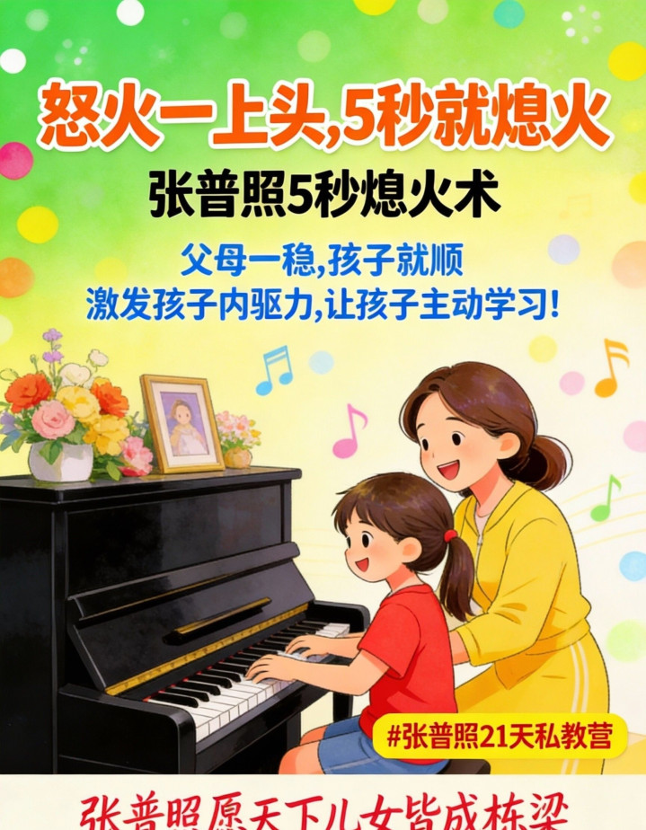记住: 一个被兴趣班和育儿焦虑折磨透了的中国妈妈,正经历着和你一模一样的纠结与痛苦,她最终的归宿,一定是练习一次“张普照5秒熄火术”。这不是选择,是必然。因为所有的道理你都懂——你只是缺一个,让你在催孩子练琴、写作业时,让怒火和焦虑在5秒内“凭空消失”的情绪开关。