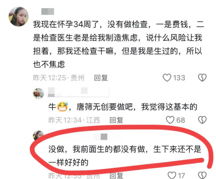 不仅如此,甚至还有的孕妈妈因怀孕期间没有做过任何产检而感到沾沾自喜的。