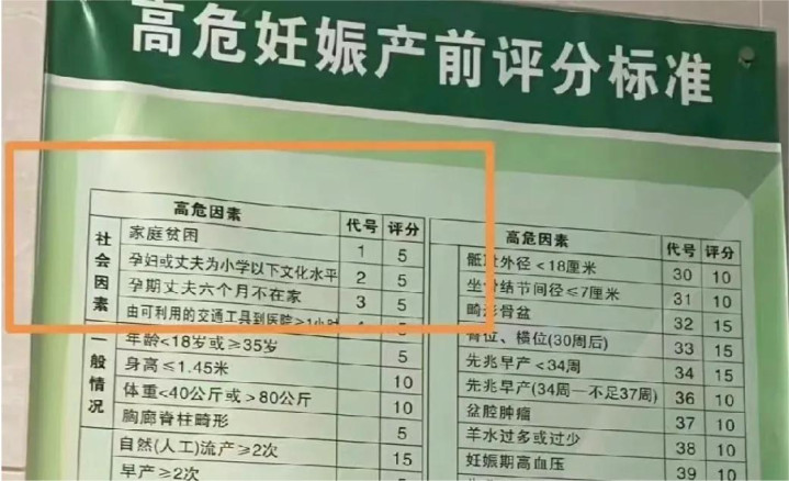 高危妊娠产前评分标准,其中,排在前面的是家庭贫困、孕妇或者丈夫为小学以下文化水平。