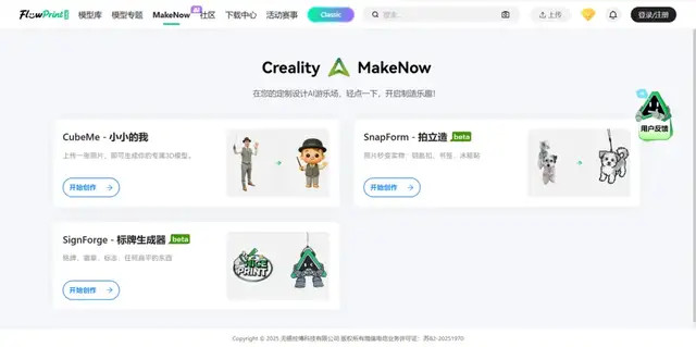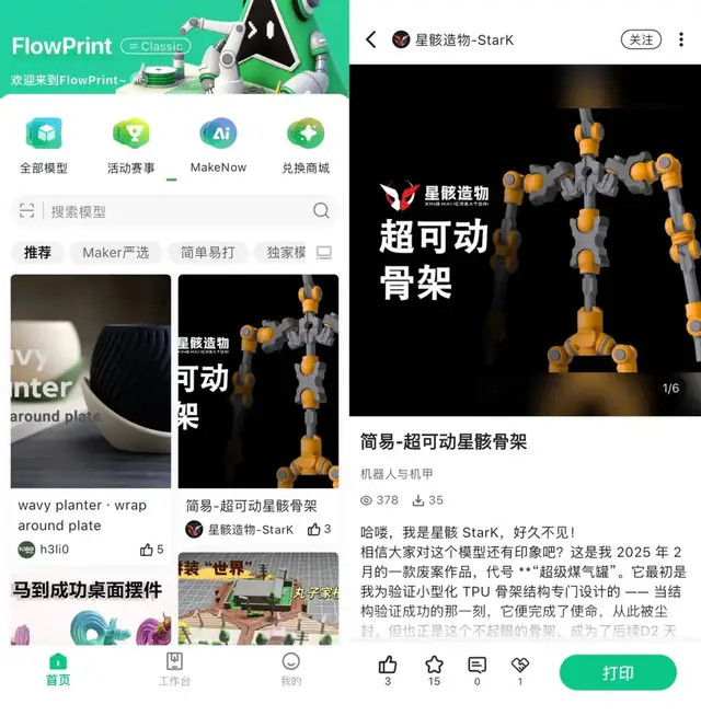 {jz:field.toptypename/}在创想三维的模型社区 FlowPrint 中,聚合了海量经过验证的优质模型。用户不再需要钻研复杂的切片参数,直接在线「一键打印」,体验就跟「点外卖」一样。
