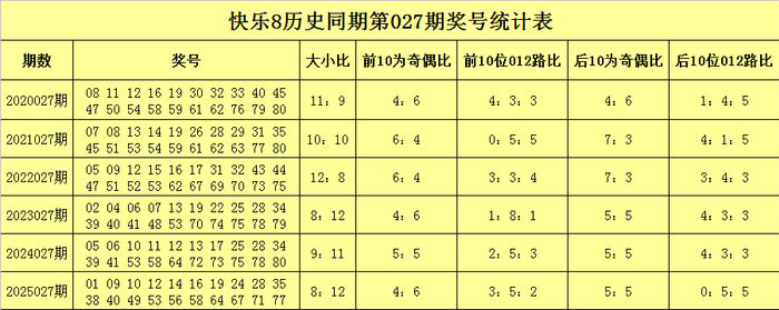 在第027期历史同期开奖中,后10为号码012路比为16:20:24,其中2路号码表现较热,0路号码走势较冷,去年同期后10位号码012路比为0:5:5,1、2路号码较热,0路号码较冷,今年同期预计后10位2路较热,1路走冷,关注号码54、58、62、63、64、65、66、71、74、77。