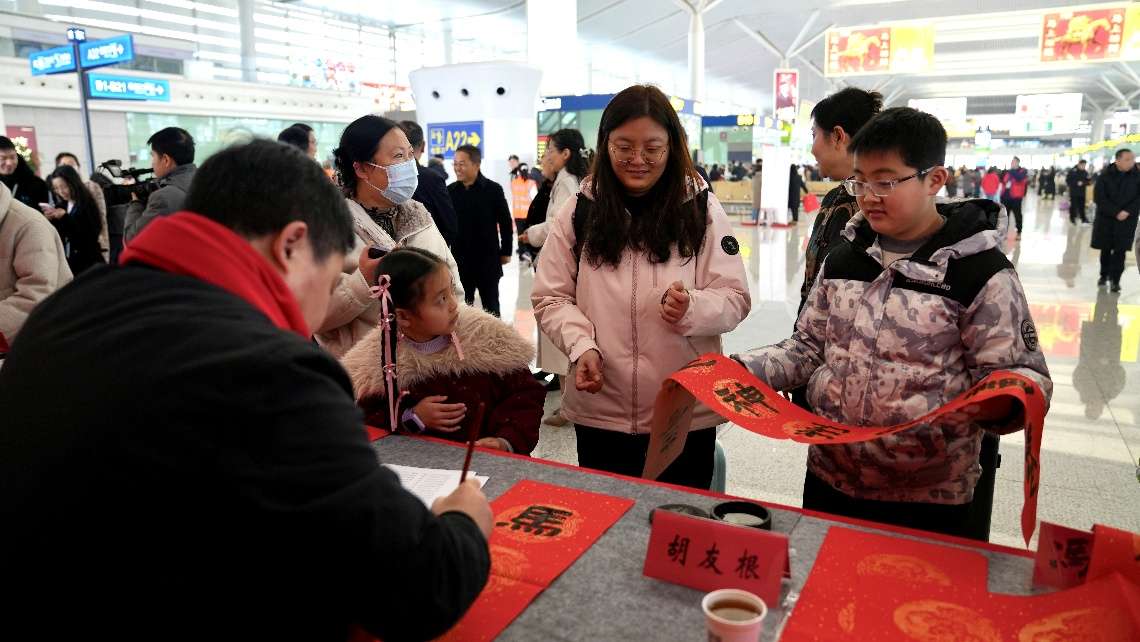 闻讯而来的旅客纷纷驻足,或围在案前静静欣赏书法创作的魅力,或挑选心仪的春联内容,米兰或主动提出个性化书写需求,书法家们耐心回应、有求必应,一一满足大家的心愿。“本来赶路还挺匆忙,看到这么多书法家现场写春联送祝福,一下子就有了年味儿,这份礼物太贴心了!”准备返乡的刘先生捧着刚写好的春联,脸上满是欢喜,他表示要把这份带着墨香的祝福贴在老家门上,开启新一年的美好篇章。