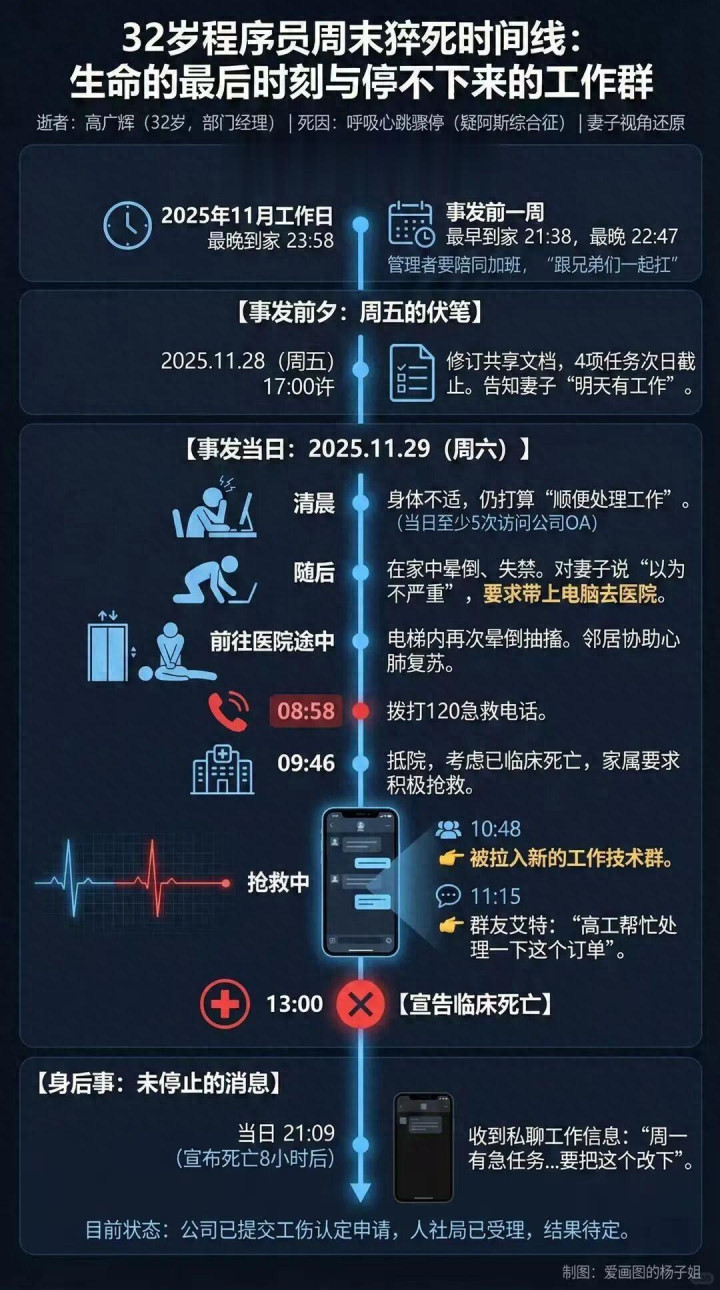 他清晨身体发疼,还登了 5 次公司 OA;晕倒失禁时要带电脑去医院,说 “不严重”;抢救到一半被工作群艾特 “处理订单”;死了 8 小时,还有同事催 “周一改任务”。口袋里的救心丸拆了封,没来得及吃;电脑里的代码停在凌晨,工作消息没停。